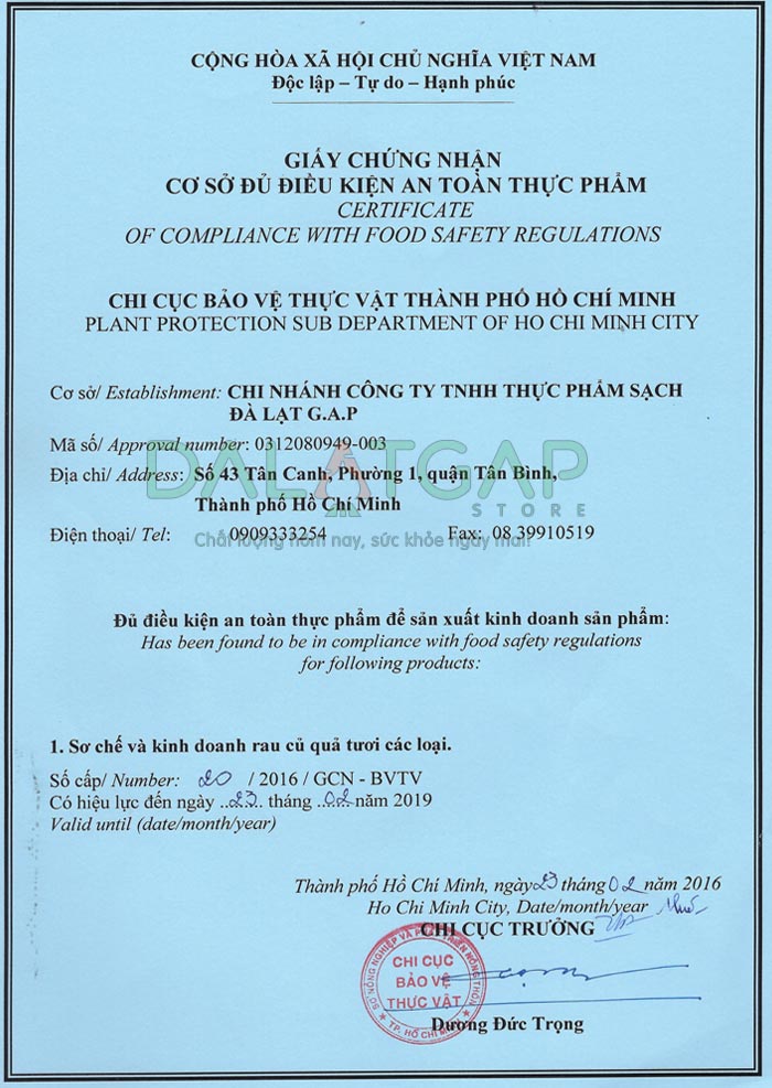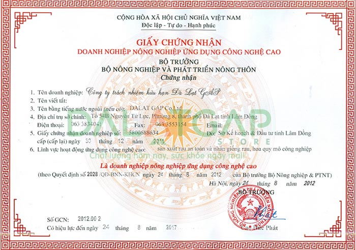 - Công ty Đà Lạt G.A.P là công ty đầu tiên tại Việt Nam xây dựng và duy trì hằng năm hệ thống quản lý chất lượng theo tiêu chuẩn Quốc Tế Global G.A.P về rau quả từ năm 2008. Đó là, tiêu chuẩn “thực hành nông nghiệp tốt toàn cầu” (Global Good Agricultural Practice), chứng nhận bởi tập đoàn Control Union.